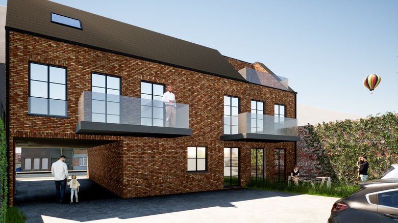 Omschrijving: nieuwbouw meergezinswoning in landelijke stijl in centrum Sint-Laureins. De bestaande bebouwing wordt afgebroken en er wordt een nieuw appartementsvolume gebouwd met 4 woonunits.